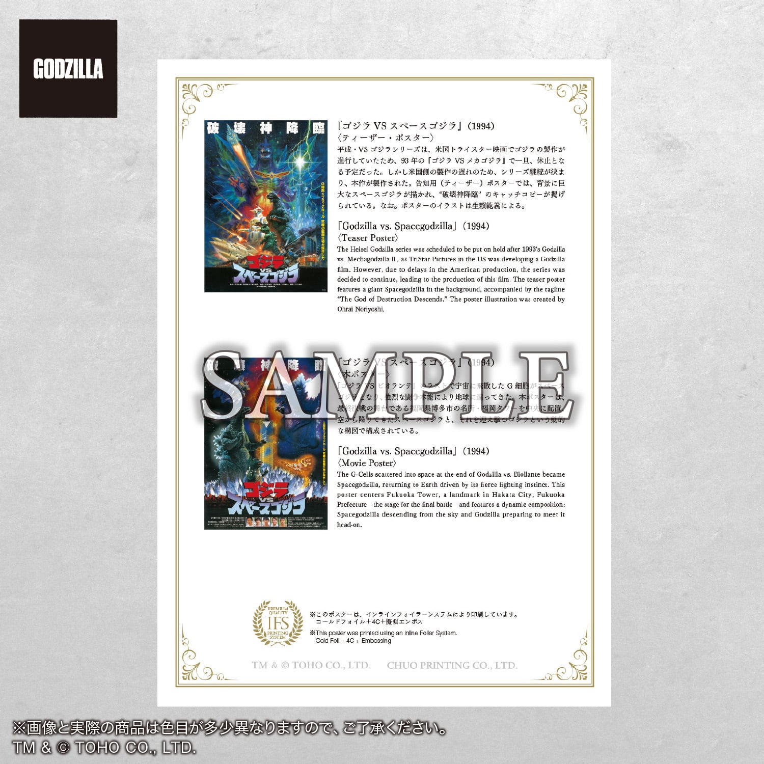 箔印刷(インラインフォイルシステム)によるプレミアムポスター。劇場公開時のポスターが持つ圧倒的なビジュアルはそのままに、箔と擬似エンボスでスペシャリティな輝きをプラス。あなたのお部屋で最高級の輝きと存在感を放ちます。各セットごとに、このポスターだけの特別な解説書付き。全世界のゴジラファン垂涎のプレミアム映画ポスターです。各セット2枚入り。